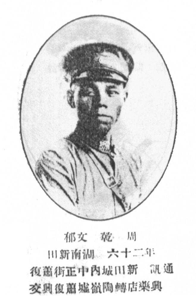 周乾,湖南新田人,黄埔军校第六期步兵第三队,1900年生,别号:文郁,籍贯:湖南新田,部别:黄埔军校第六期步兵第三队,其他无记录,入校通信地址:新田城内中正街萧复兴药店转陶岭墟萧复兴交。