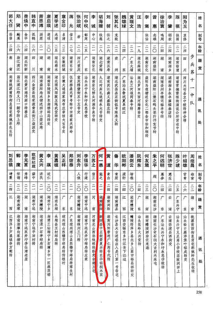 何一愚,湖南新田人,黄埔军校第六期步兵第十一中队,1905年生,别号:勉之,籍贯:湖南新田,部别:黄埔军校第六期步兵第十一中队,其他无记录,入校通信地址:湖南新田县中正街萧复兴转东华镇桐木窝。
