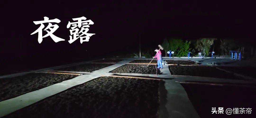 “夜露:白露节气后,选晴天有雾夜晚,白天先对干茶进行高温打火,越干越好。再置竹垫于室外,将高火后干茶铺其上,以厚约10厘米、宽约20厘米开沟,且每隔数小时许翻一次,以尽吸露水,至次晨才收起。”