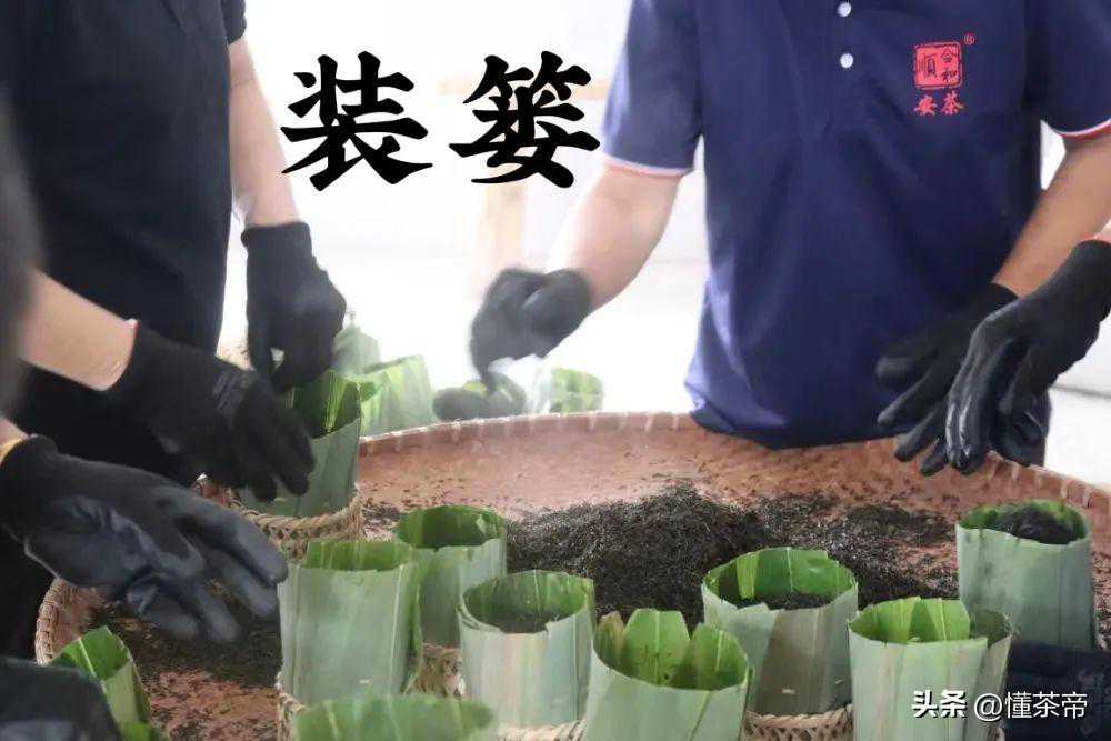安茶在“装篓”这一道工序上别出心裁地以箬叶衬底,以竹篾编篓!即将蒸好的茶趁热装进内衬箬叶的竹篓,过秤足量,压紧压实打包成篓装茶。