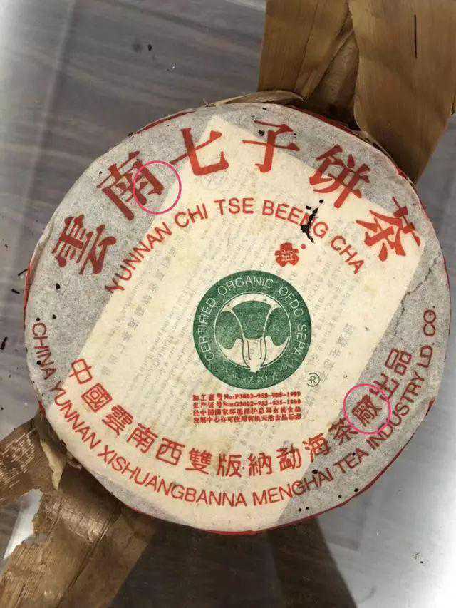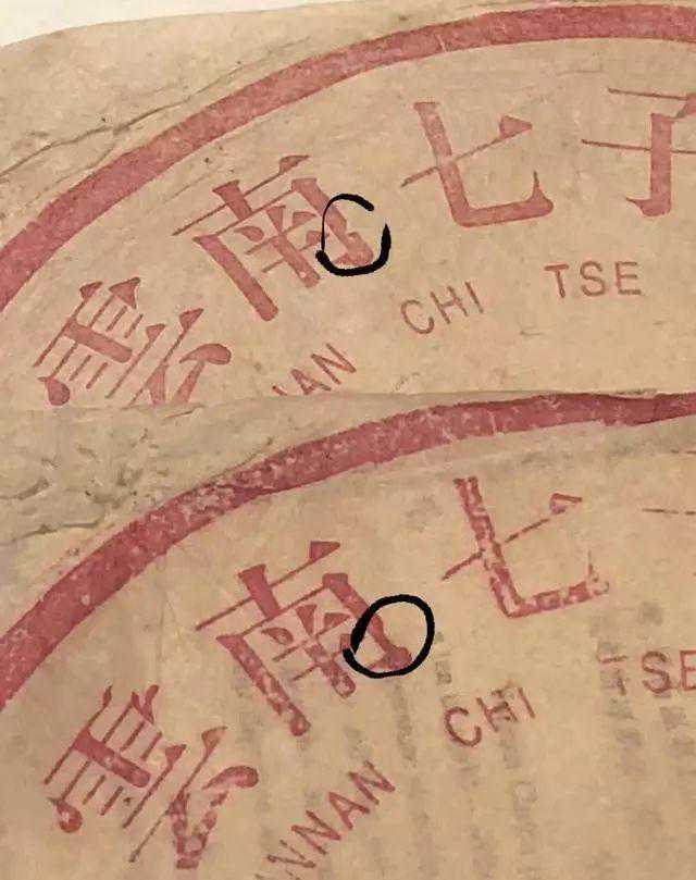 版面特征:由于当时印刷技术的原因,“雲南七子饼茶”中的“南”字右下角有连带一点,“廠”字里面连带一点,