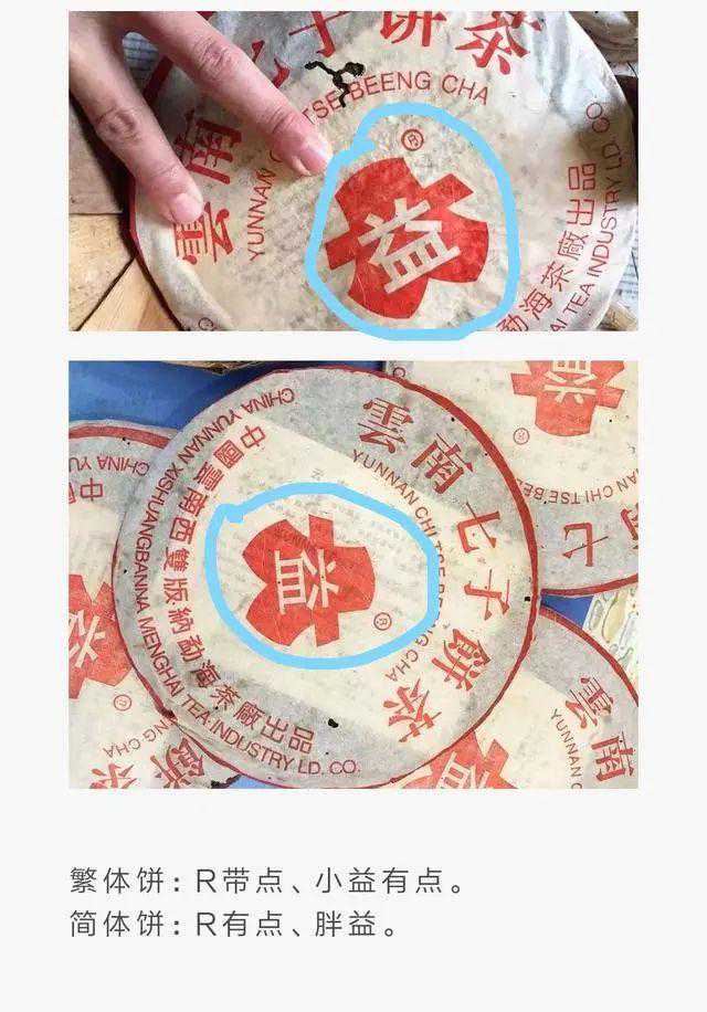 二、外包装纸字体印刷方面:繁体“中國土產畜產進出口公司雲南省茶葉分公司”的“中”字,在70/80年代,大口“中”比小口“中”出厂时间早;在八十年代,云南省的繁体“雲”字,“雨”字头的横析勾连到第二点的比连到第一点的出厂时间更早(如1980年出品的7532两点;1985年出品的7542一点);在90年代,“云南七子饼”的“七”字,窄脚的比宽脚的出厂时间早(93年前为窄脚七,93后宽脚七)。