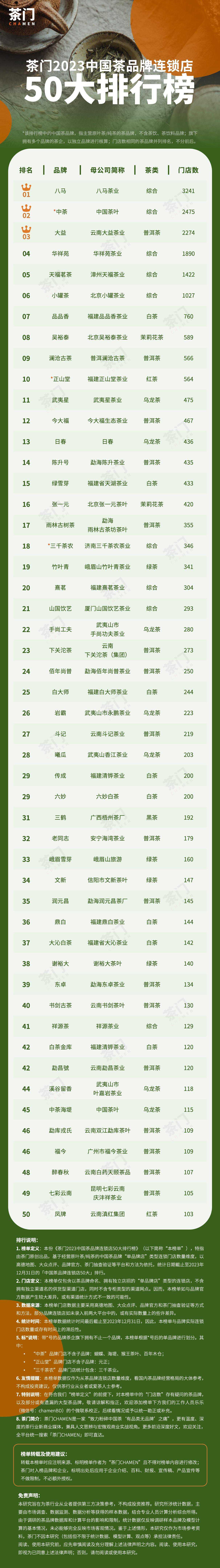 以下是本次重磅揭秘的《茶门2023中国茶品牌连锁店50大排行榜》,请尽情享用。
