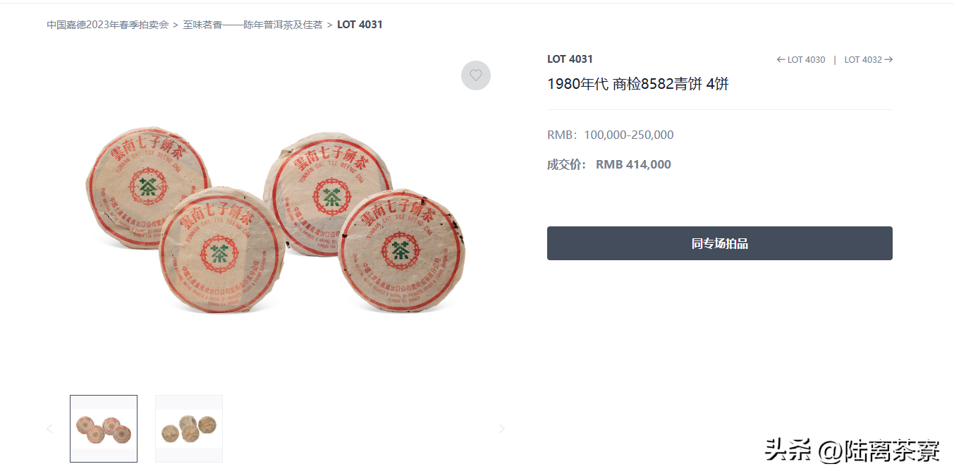 而在陆离看来,其流拍的最大原因可能是整件规格+茶品不算出名,早春乔木在圈内虽然有一定名字,但在嘉德这种顶级拍卖场上还是太不显眼了,整件的规格又决定了其需要找到对的人才能成交,两种因素叠加之下,没找到买家也不算奇怪。