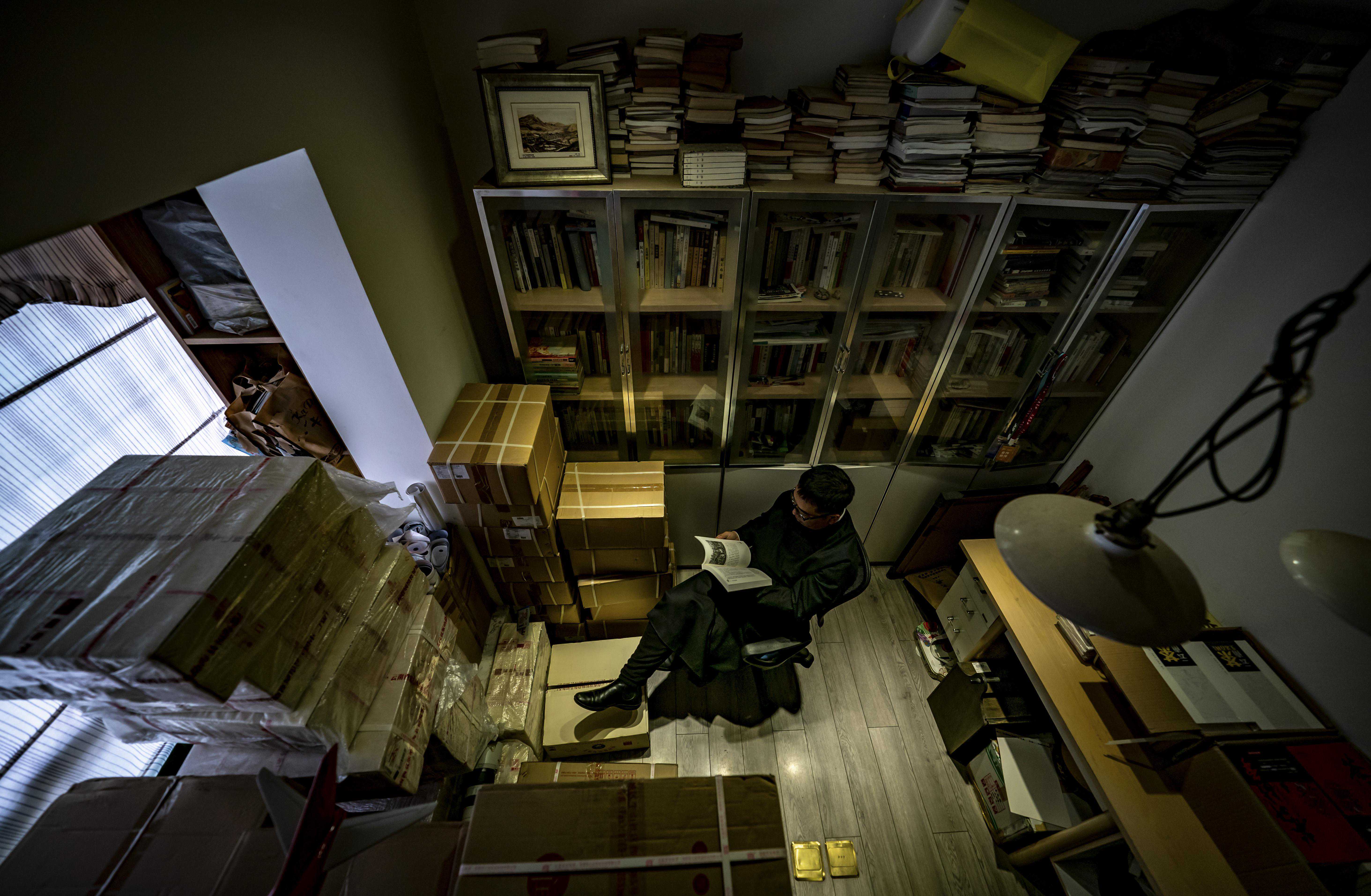 周重林在他的藏书间看书(4月21日摄)。新华社记者江文耀摄