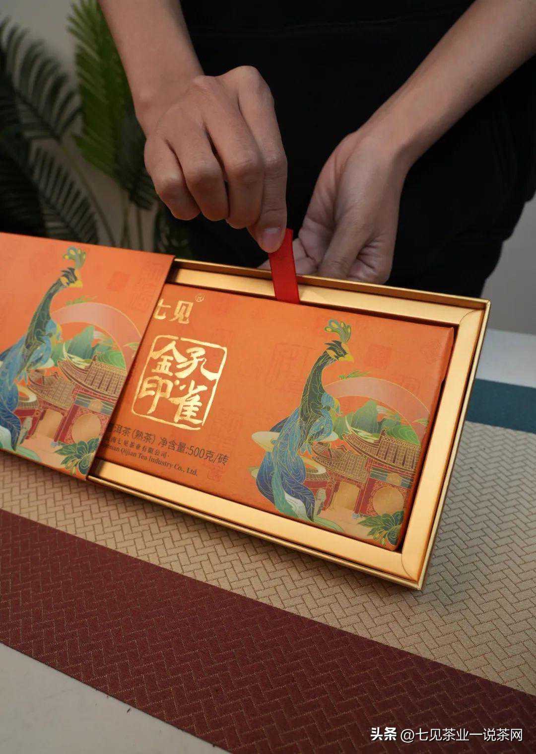 孔雀是普洱茶源产地西双版纳的吉祥物,七见班章金印孔雀金砖,以孔雀为设计灵感,寓意“福瑞吉祥”,茶质不俗。