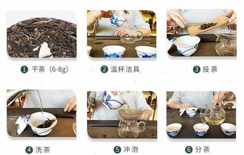 取适量茶叶,四人以内以6g为宜,人数每增加两人,投茶量增加1g。用沸水将所有泡茶及饮茶器具温热清洗,根据人数将备好的茶叶投入泡茶器具,沸水冲泡两道,出汤时间在5秒内,以防茶叶内涵物质流失过多,茶汤用于再次温杯或直接倒掉。保持90℃水温正式冲泡前两道,闷泡时间为8秒左右,可根据个人口感浓淡进行时间调整。八道之前水温可在87℃左右,之后则需提升水温。投茶量可根据品饮人数有所增加,但即使人数少于4人,亦不宜少于6g投茶量。