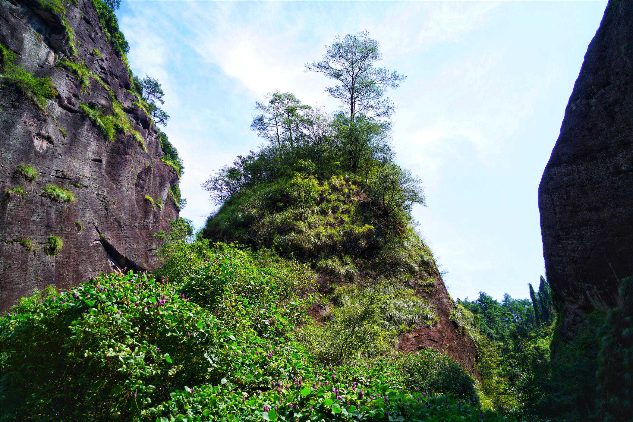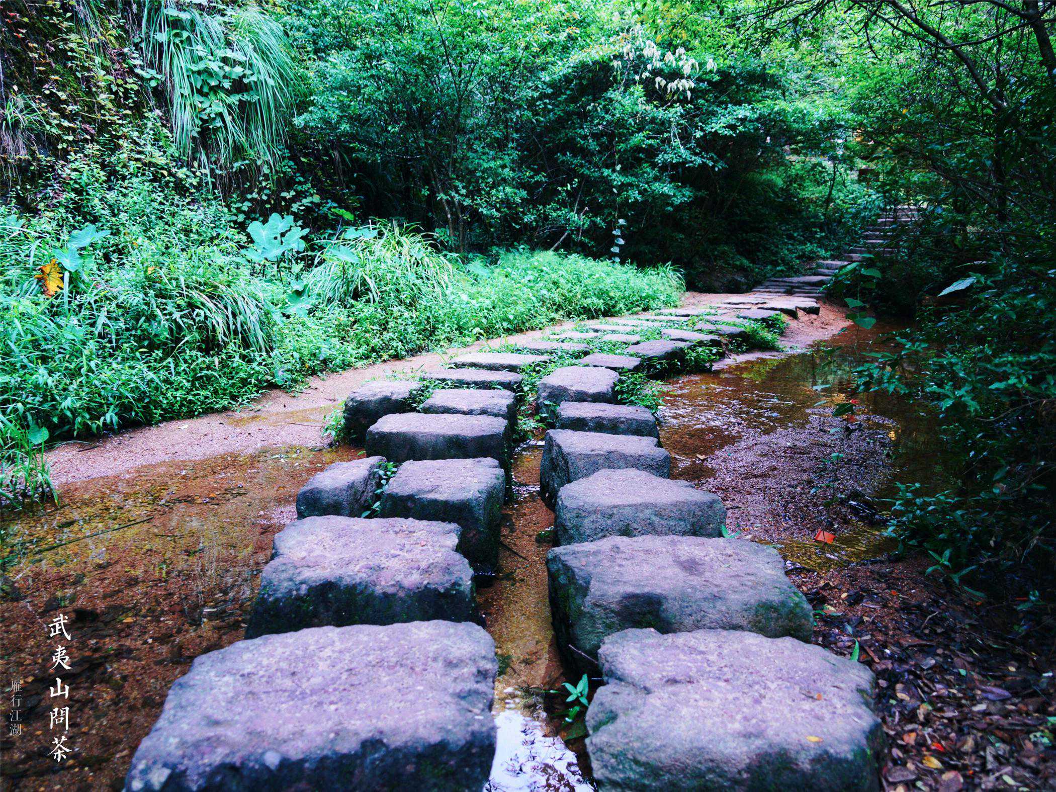 沿着山间小路缓缓而行,两旁都是大红袍茶树,大红袍是中国茗苑中的奇葩,素有"茶中状元"之美誉,乃岩茶之王,堪称国宝。全国各地种植大红袍的地方很多,却以武夷山景区内种植的品质最优。