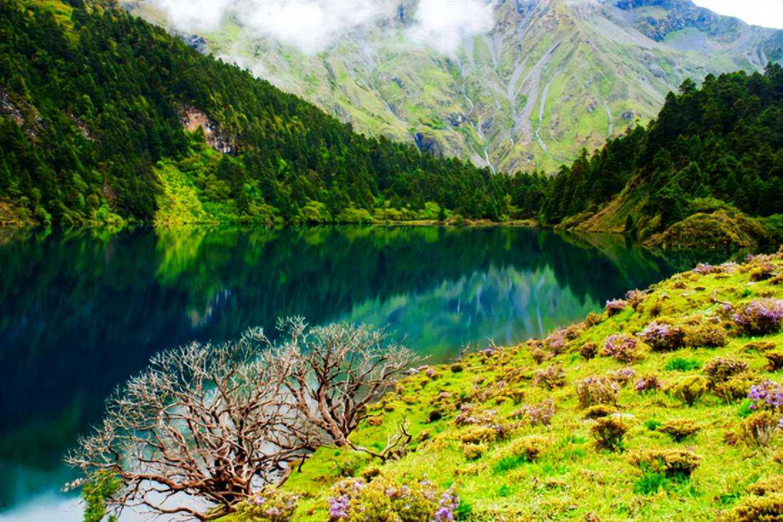 湖边为高大的高山杜鹃树所环绕