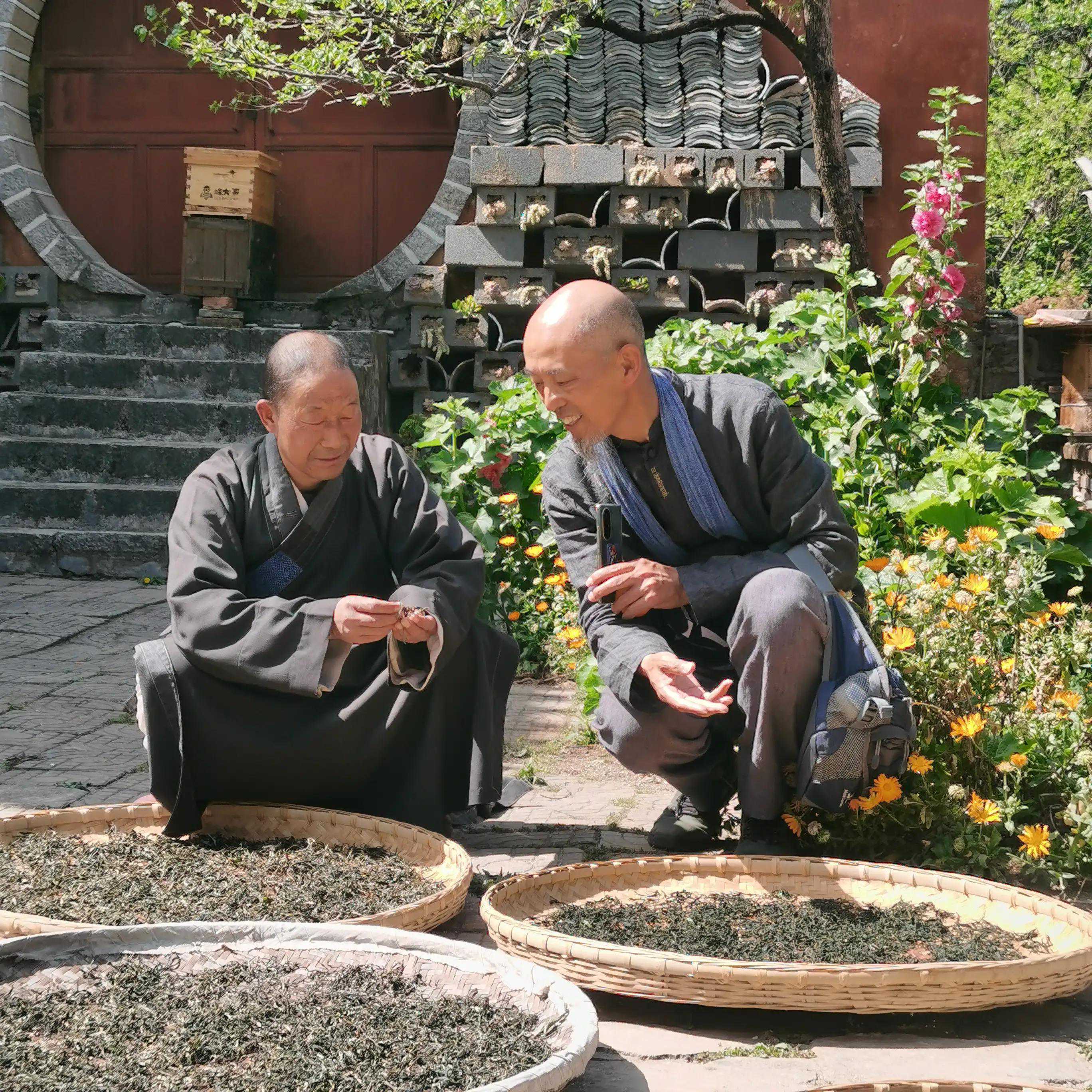 早在后院帮厨。饭毕,我们见到了正在炒制“感通茶”的传慈大和尚,他脸色稍深、形体清瘦、颇有精神。
