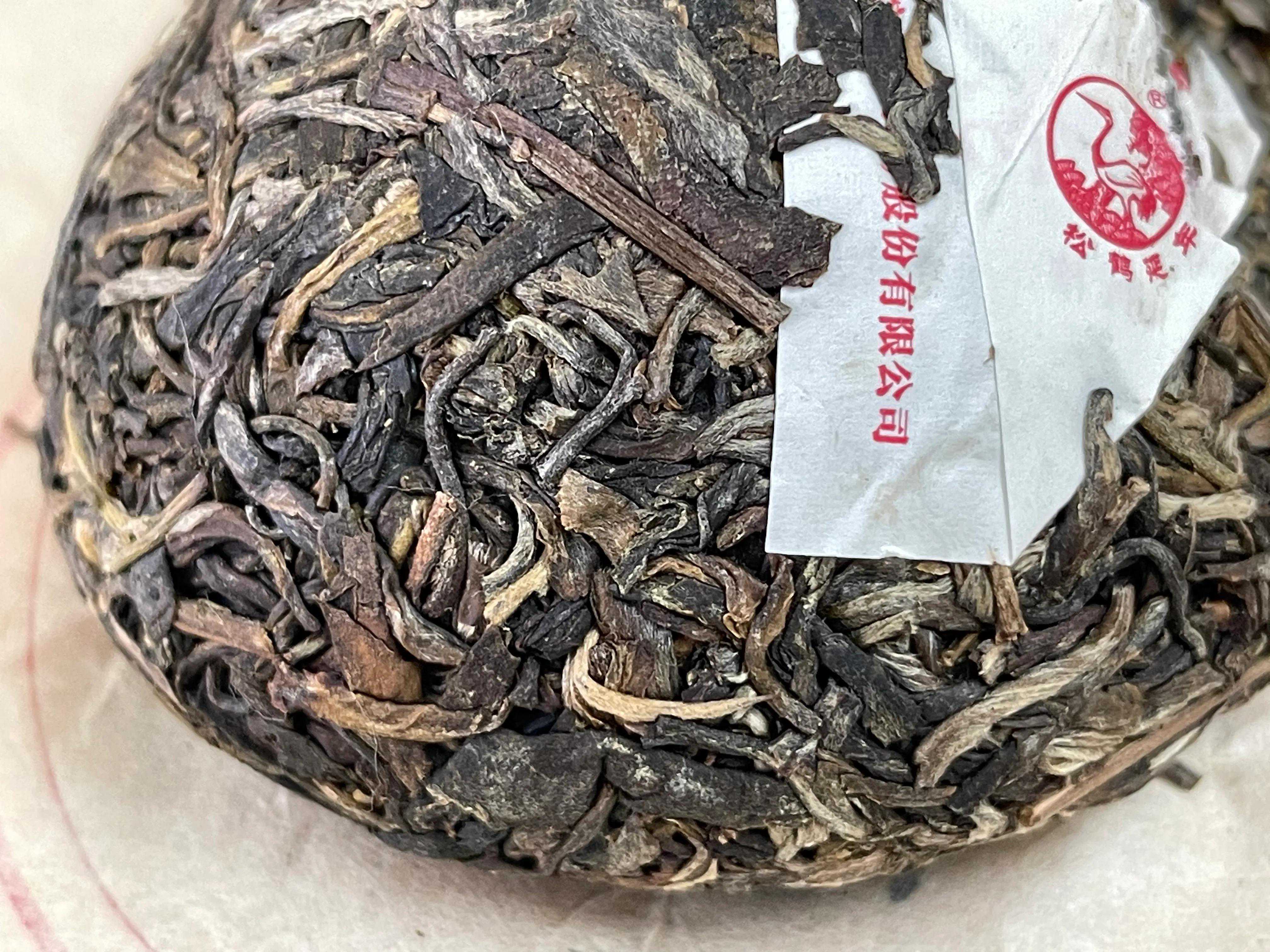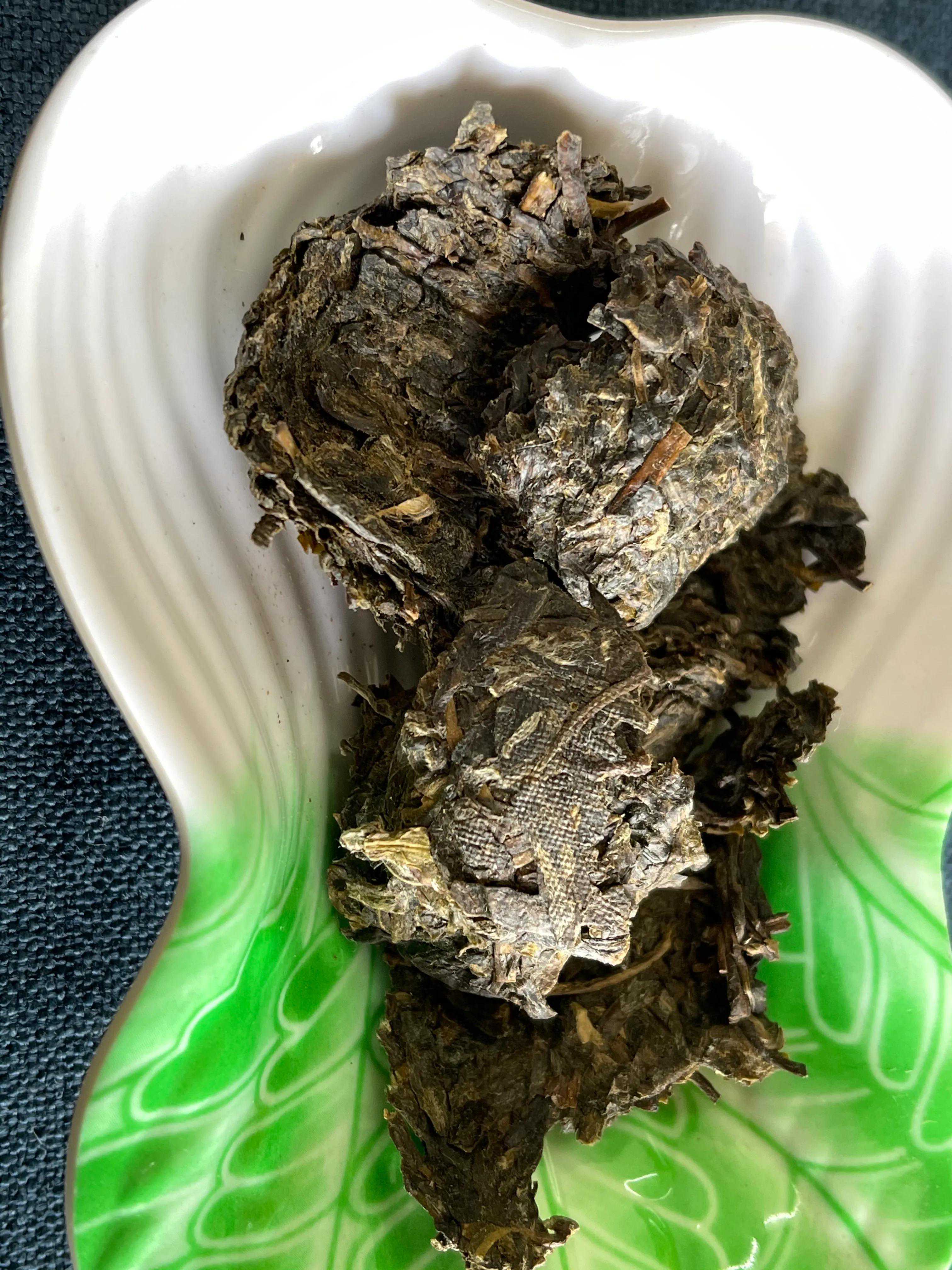 干茶:沱形呈碗臼状,端正较紧结,色泽深绿尚润,条索较紧实显白毫略有梗。略微烟味