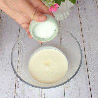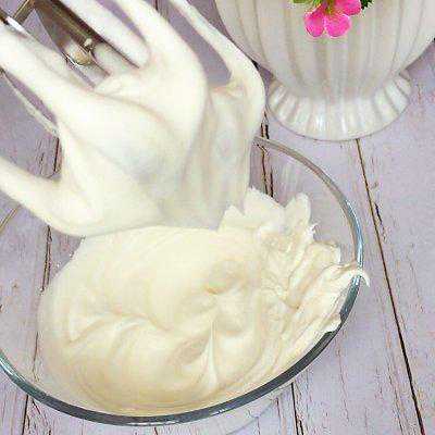 7、白糖倒入淡奶油中,用电动打蛋器打至8分发,装入裱花袋中