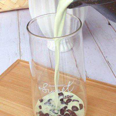 8、杯子里放一勺蜜红豆,倒入奶茶