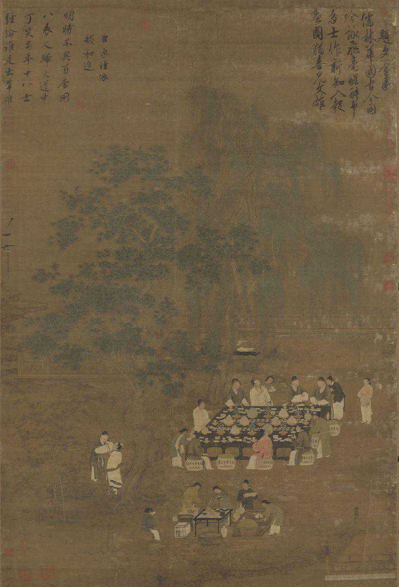 一些唐宋雅集绘画有这类描绘,比如《西园雅集图》、宋徽宗的《文会图》、文徵明《惠山茶会图》等等。可以在亭台楼阁中,也可以在山林溪泉边,有茶、有酒、有诗、有书、有画、有文人之间的这种交流。