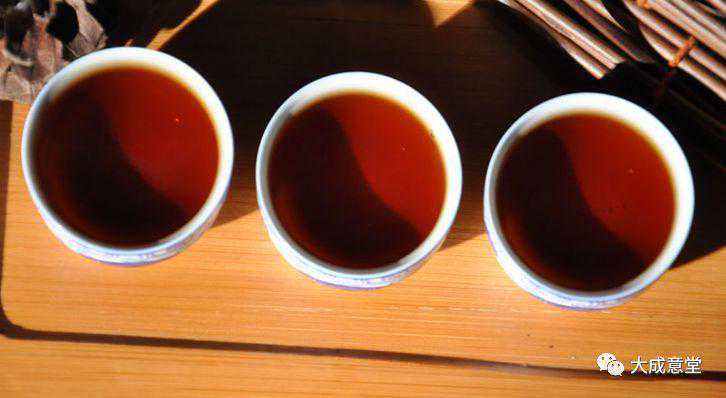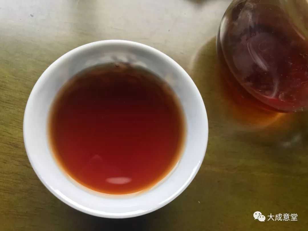 洗茶开汤,茶味香浓,汤色褐红透亮,悠悠陈香;汤质油滑,口感稠厚,茶汤柔滑,有入口即化之美感,数杯之后感通体舒泰,回甘回甜,因稍有梗,甜度比一般茶尤甚,茶底油光发亮,仍呈现很好的活性。