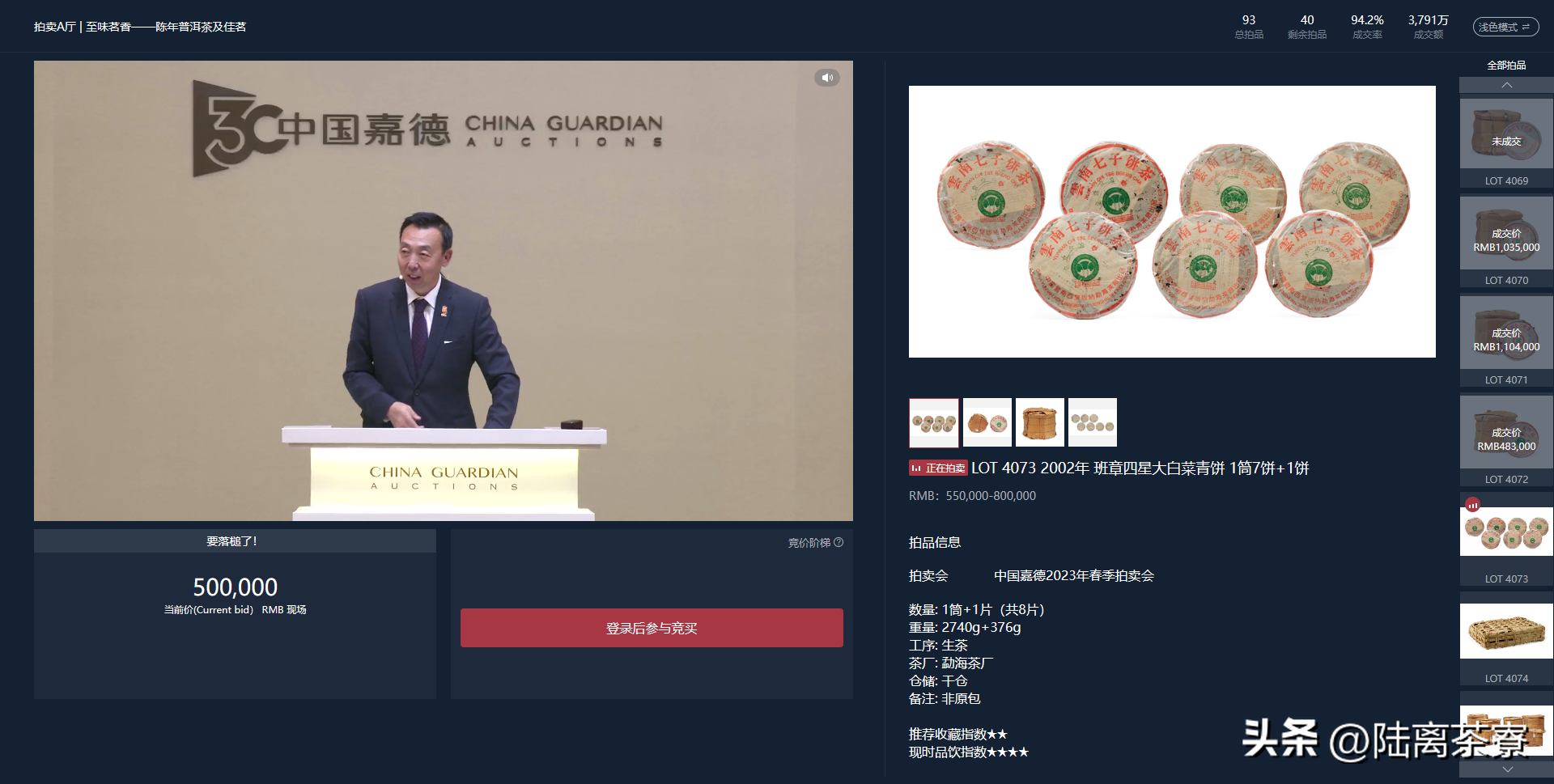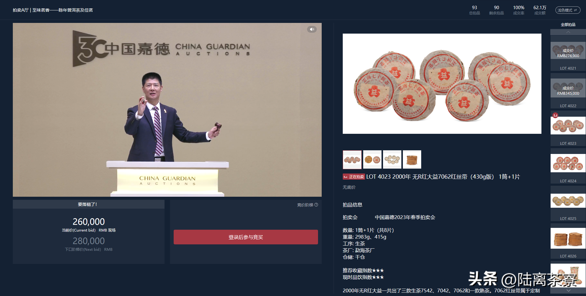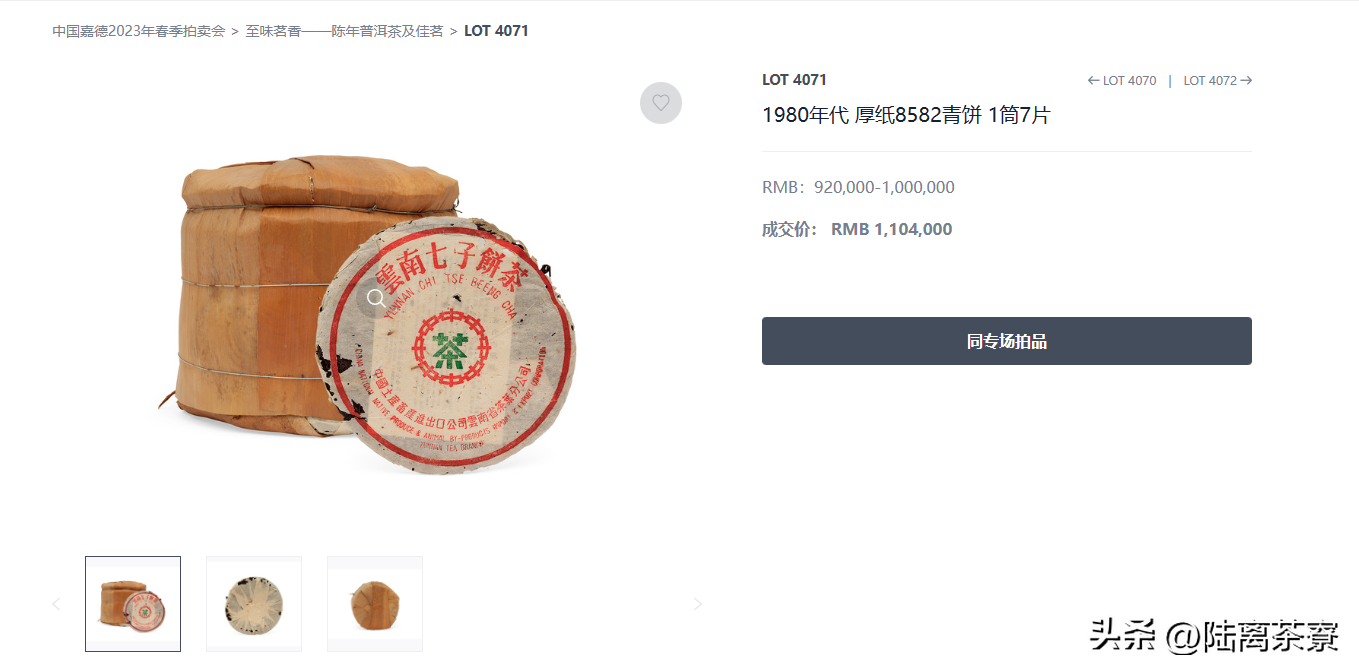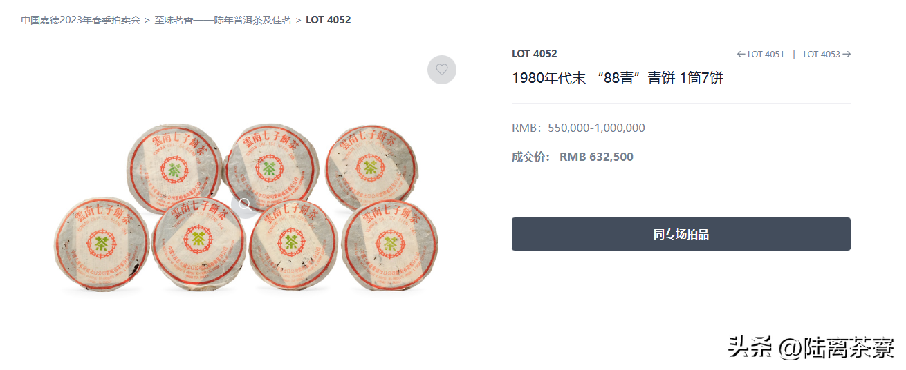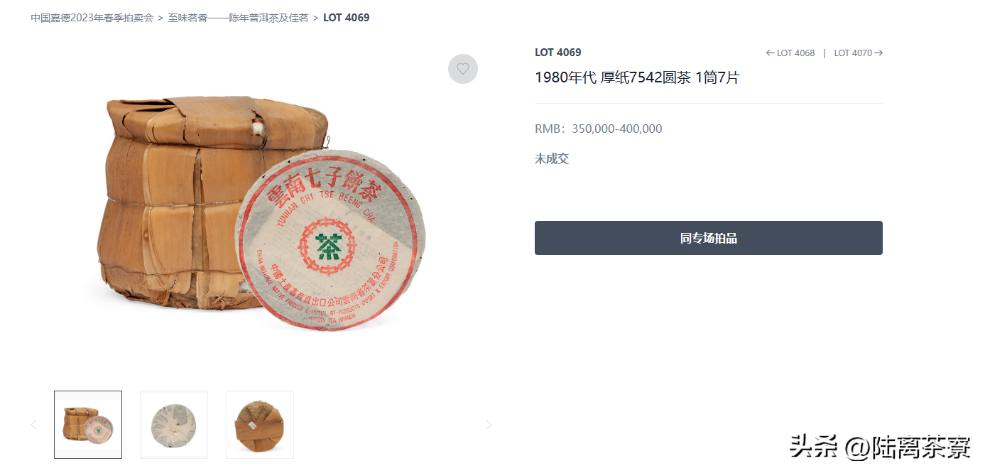 而在陆离看来,其流拍的最大原因可能是整件规格+茶品不算出名,早春乔木在圈内虽然有一定名字,但在嘉德这种顶级拍卖场上还是太不显眼了,整件的规格又决定了其需要找到对的人才能成交,两种因素叠加之下,没找到买家也不算奇怪。