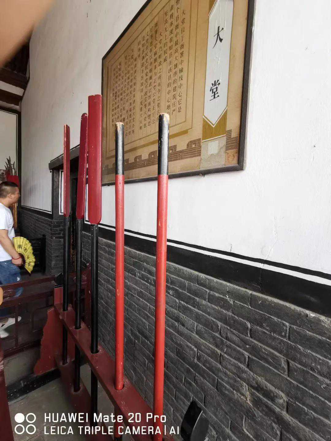 平遥县衙(图一)一进院落布局,正中为大堂(图五),为县长升堂问案之地,两侧厢房分别为县属办公场所,文东武西(图二三)。县长桌案之上设惊堂木一块(重量一斤,古制,合十六两,所以才有成语“半斤八两”一说)、签筒方圆制各一(分装红黑或红蓝两色签。红签为死签,蓝签为刑签,县长掣出红签即意为死刑,蓝签则为棍棒或拶刑等。签筒容积一升,每签长一尺。古时大堂不问案时,百姓买卖交易如觉对方缺斤短两,可以以惊堂木、签筒和长签来计量度量衡,算得上是最早的公平尺公平秤。)堂侧为皂役站立之所,旁边立有棍棒等刑具(图六),县长一旦需要对人犯用刑,皂役则需用棍棒“伺候”(古称“敲扑”,贾谊《过秦论》有“执敲扑鞭笞天下”即指此)。人犯亲属如提前买通县长及皂役,则以板杖施刑,人犯虽皮开肉绽但不致伤及性命;如不提前贿赂,皂役则以棍棒施刑,往往一棒下去,人犯屁股青紫却不见渗血,基本三五棒即可夺人性命。据传古代皂役培训时纸下放肉,打到肉烂纸不破方为出徒,看来在古代打板子也是个技术活哩!