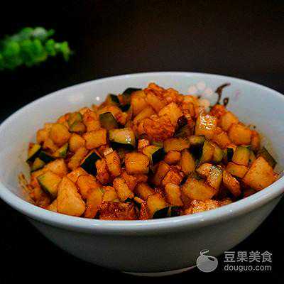 2、连籽带皮切成小丁儿备用,稍微要切的小一点再放进一个大的容器里