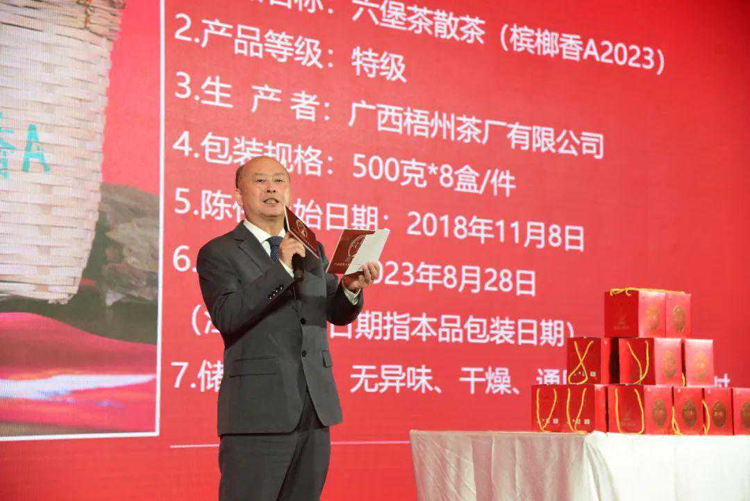 梧茶公司技术顾问、广西工匠杨锦泉为新品【槟榔香A2023】揭幕并作推介,这款【槟榔香A2023】是梧茶公司优质原料、领先技术、独特陈化的结晶,传承延续了经典【槟榔香A】的风格,凭借公司多年来对槟榔香六堡茶加工工艺的钻研与优化,令三鹤槟榔香的滋味稳定而清晰地呈现,让每位茶友都能喝懂槟榔香、爱上槟榔香。