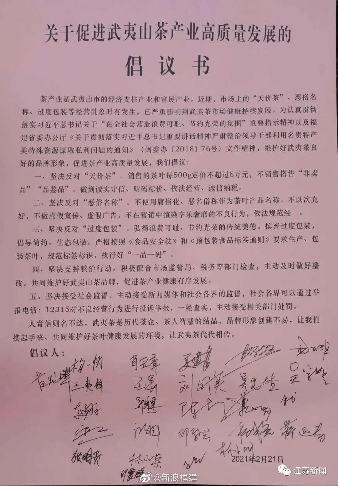 21日下午,武夷山市召开促进茶叶市场健康发展推进会,26家曾出现在网传“天价茶”榜单上的武夷山茶企负责人共同签署《关于促进武夷山茶产业高质量发展的倡议书》,坚决反对“天价茶”“恶俗名称”“过度包装”,承诺不做虚假宣传,规范经营管理,不销售“非卖品”“品鉴品”,自觉接受监督。