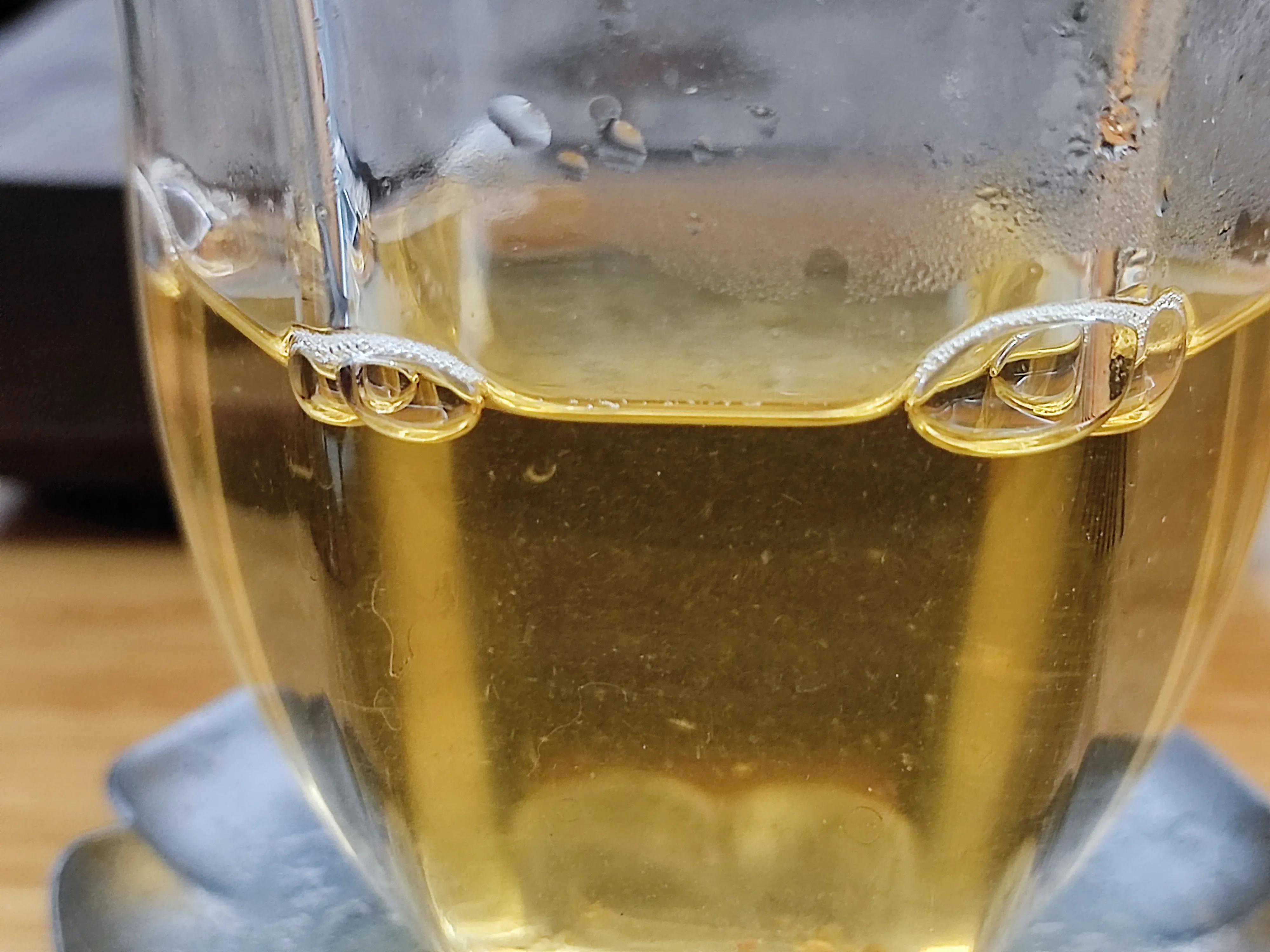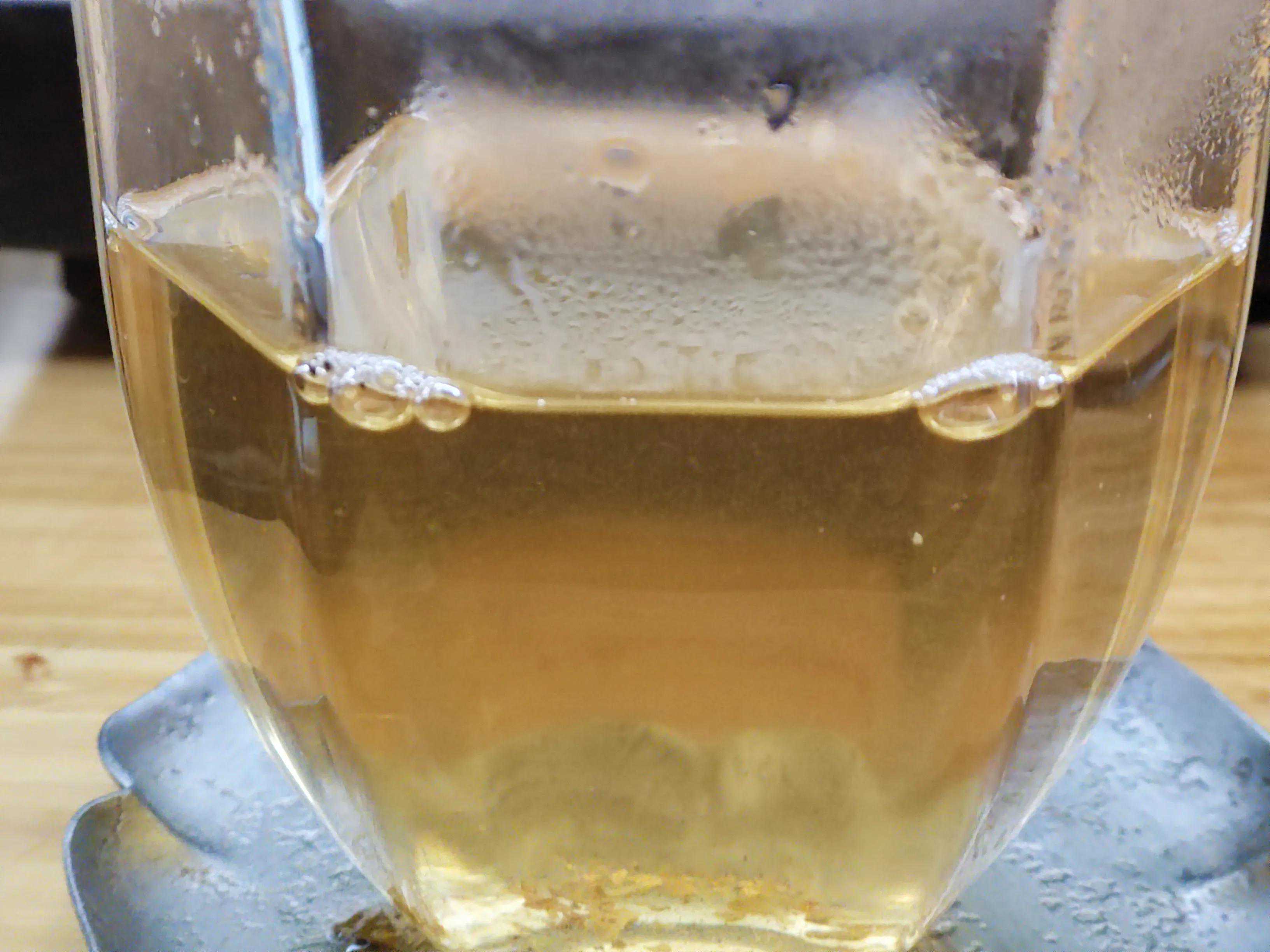 苦底中等,厚度适中,涩感比较明显,生津速度还不错,但强度一般化,涩感影响水路,这比牛饼和绿豆饼要弱上许多。香气浓度中等,挂杯香弱,蜜香中有焖出的青味,杀青适当,但明显有低温长炒的痕迹。喉韵出,茶气不现,回甘弱。