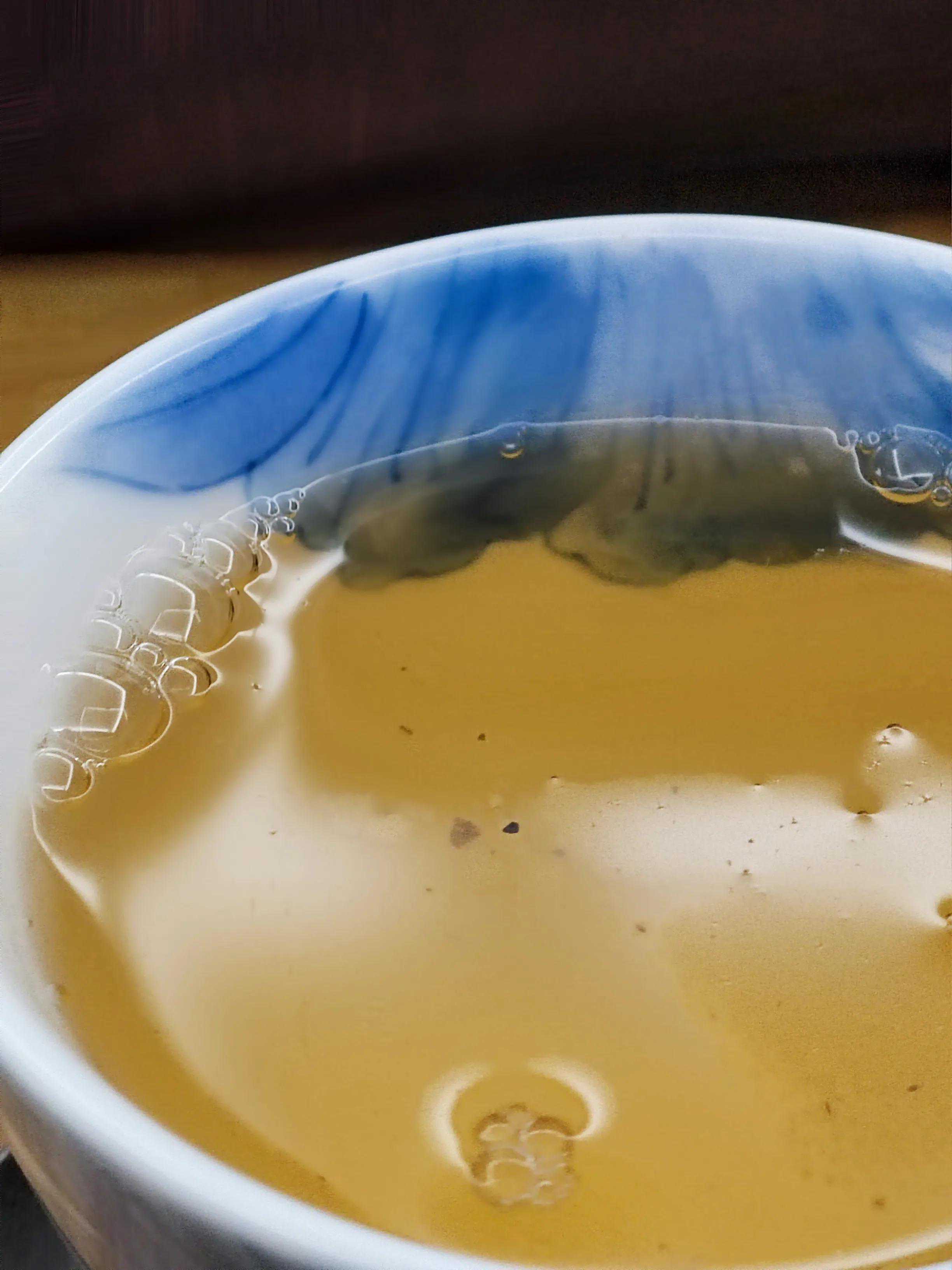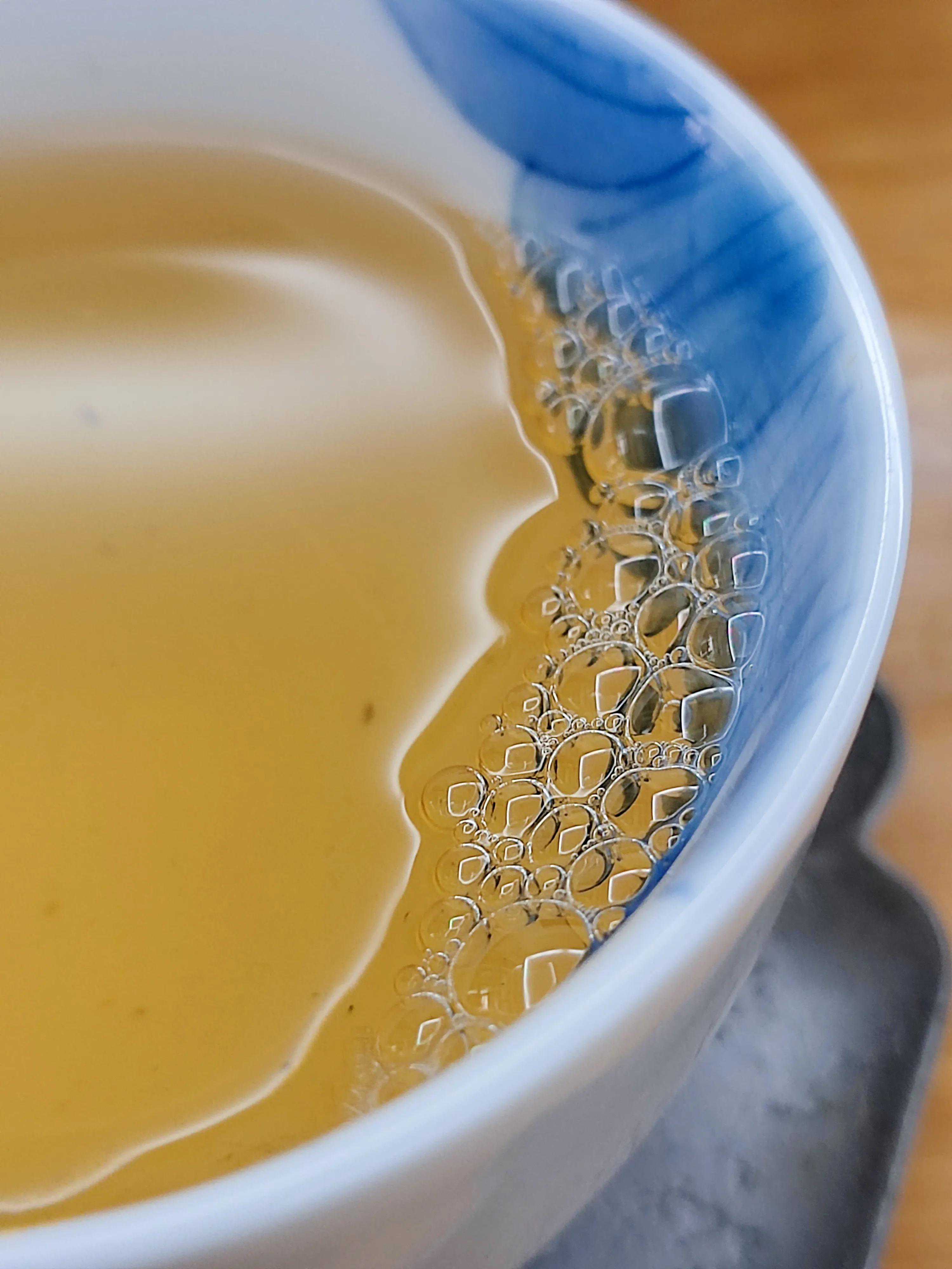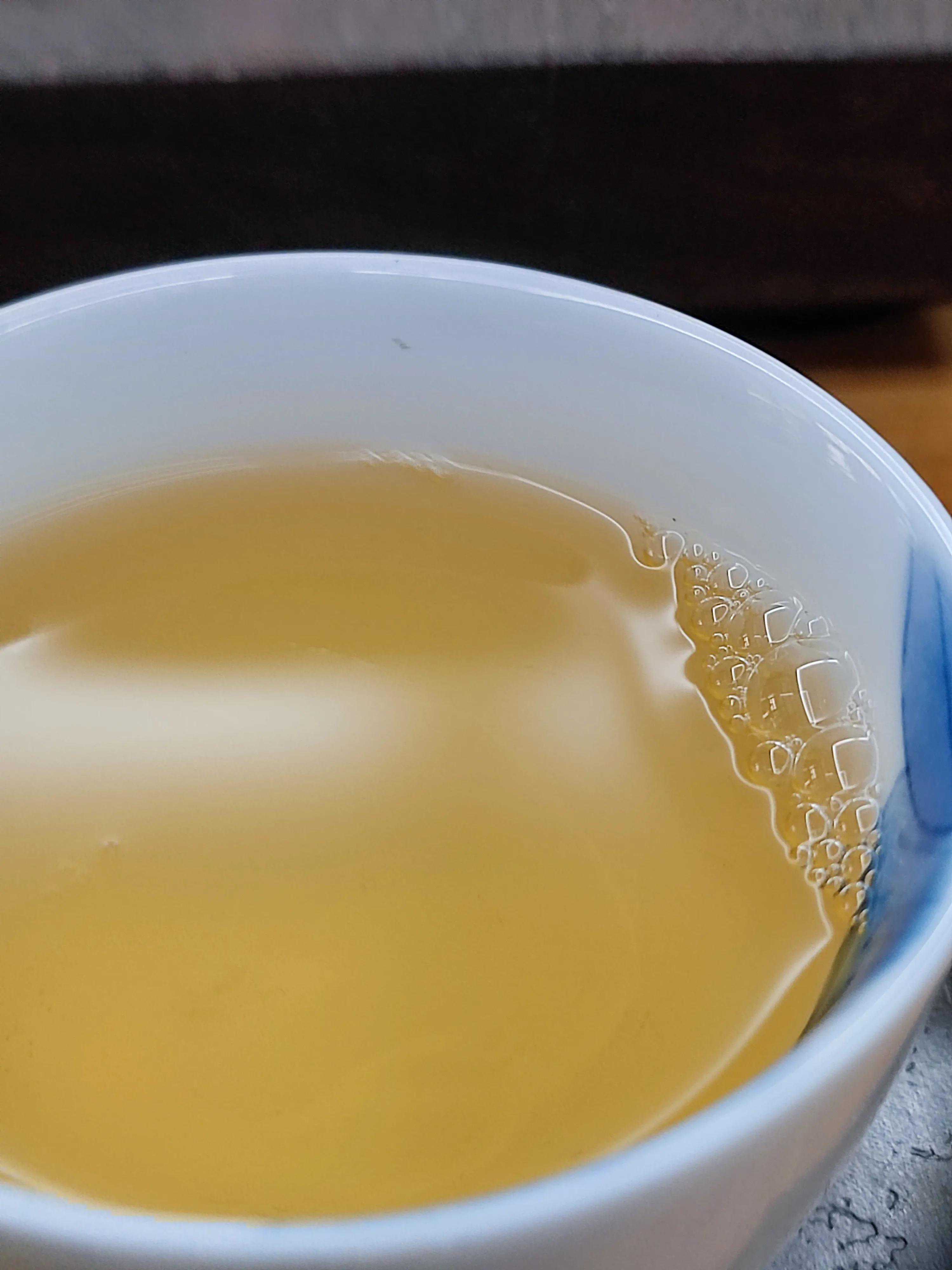 厚度开始上升,苦底不变,甜香开始主导香气,青味略杂于其中。涩感褪去许多,汤感改善明显,但并不显细腻,滋味清淡,生津感有一定上升,喉韵开始明显,茶气出。此泡有回到传统滋味的意思。