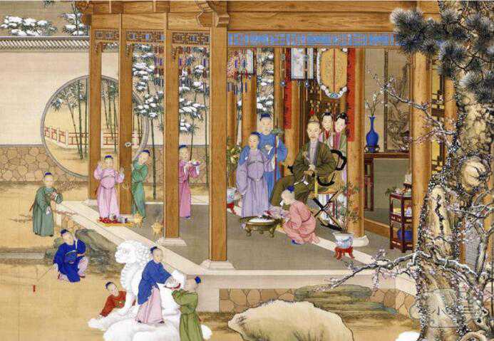 ▲《弘历雪景行乐图》是由清代外国画家郎世宁等绘所作的一副画作,描绘乾隆皇帝与众多皇子新年在宫苑赏雪的情景。