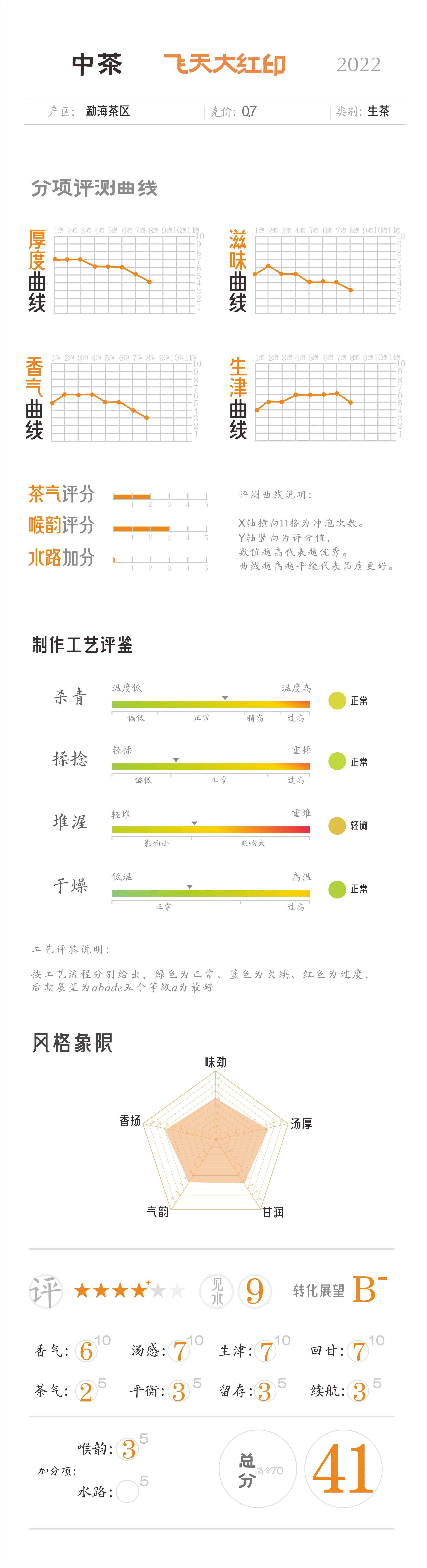 中茶这款飞天大红印总体表现出均衡的风格,往好点说是平衡性好,往差点说就是平庸,结合总体口感,给出平庸的评价并不为过。