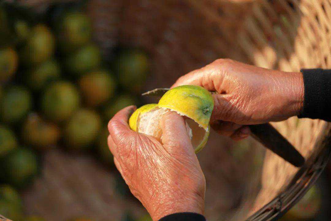 ▲一般新会茶枝柑开皮采用“正三刀”、“对称二刀”和“丁字二刀”三种方法人工开果取皮。