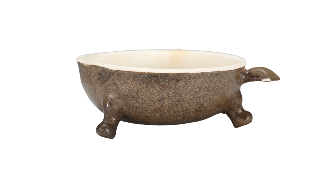 巩县窑外茶叶末釉里白釉茶铛的型仿唐代金银器,陕西何家村窖藏出土的文物中有此类金银器。茶铛是煎茶用具之一,在唐宋诗文中多次被提及。