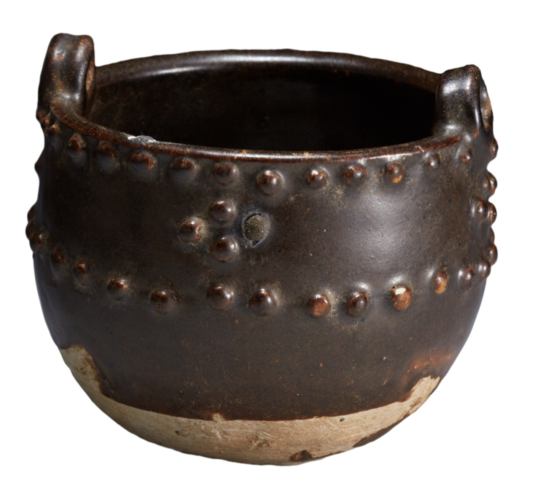 这件唐代的黑釉乳钉纹瓷鍑,直口,深腹,腹下渐收,平底,口沿立双系。器内外施黑釉,器腹部以乳钉装饰,施釉不到底。